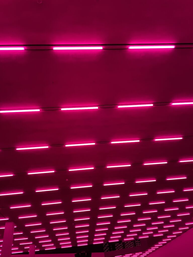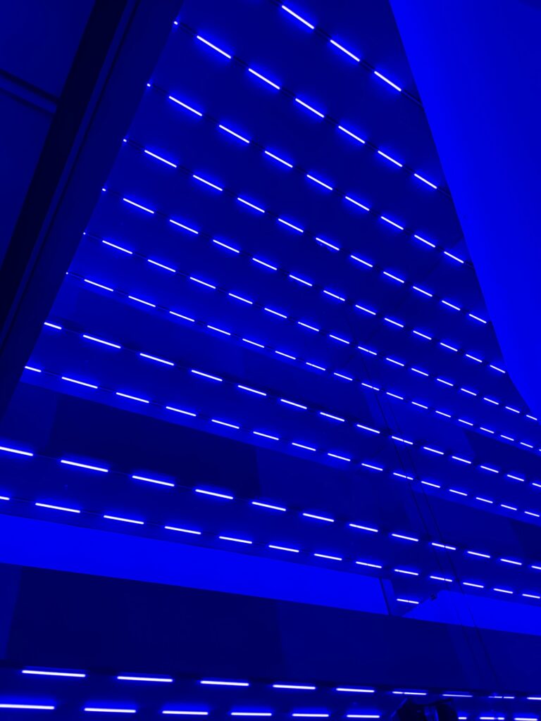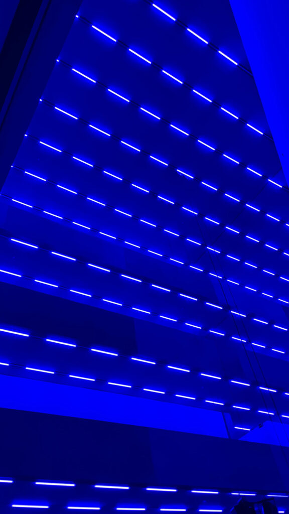 Die Installation besteht aus choreografierten Lichtfeldern, die in wechselnden Farben auf die Architektur reagieren. Kein visuelles Zentrum, kein fixer Standpunkt – stattdessen ein gleitendes Kontinuum aus pulsierenden Lichtbädern. Der Klang ist tief, vibrierend, körperlich spürbar.
