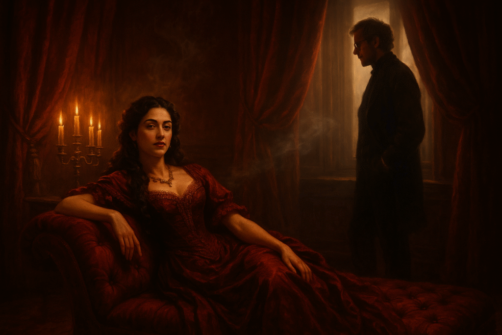 Ort: Ein abgedunkelter Salon mit schweren Vorhängen, Kerzenlicht, Schattenlinien über rotem Samt. Montez sitzt lässig auf einer Ottomane. Bataille steht am Fenster, als würde er das Licht kontrollieren wollen.**