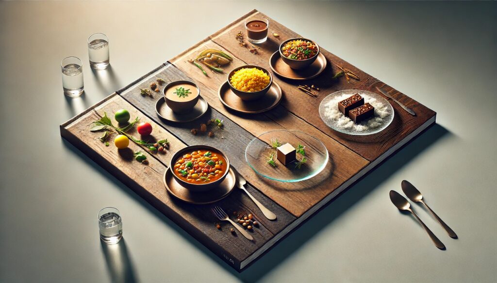 Ich lade Sie ein, mit mir auf eine kulinarische Zeitreise zu gehen. Wir werden ein Fünf-Gänge-Menü erkunden, das die Esskultur verschiedener Epochen widerspiegelt – von der Antike bis in die Zukunft –, wobei jeder Gang die kulinarischen Vorlieben seiner Zeit in einer vollständig vegetarischen Interpretation präsentiert.