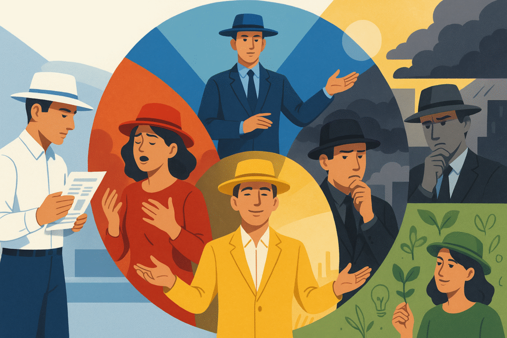 In einem futuristischen Konferenzraum symbolisieren sechs Experten unterschiedlicher Herkunft durch farbige Hüte die „6 Thinking Hats“. Sie navigieren durch Emotionen, Fakten und Kreativität, um komplexe Herausforderungen zu lösen. Die Szene verkörpert kollaboratives Denken in einer inspirierenden, technologisch fortschrittlichen Umgebung.