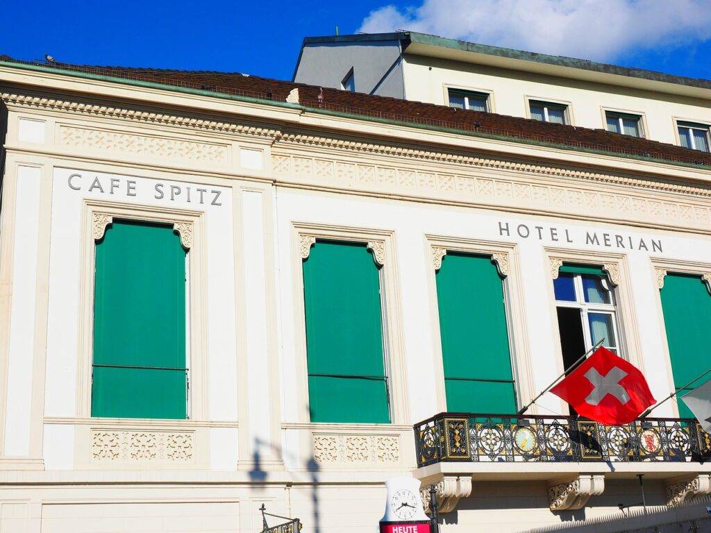 Das Rathaus der Stadt war am rechtsrheinischen Brückenkopf, heute bekannt als «Café Spitz» und «Hotel Merian».